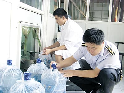 右图 执法人员正在检查成品桶装水。
