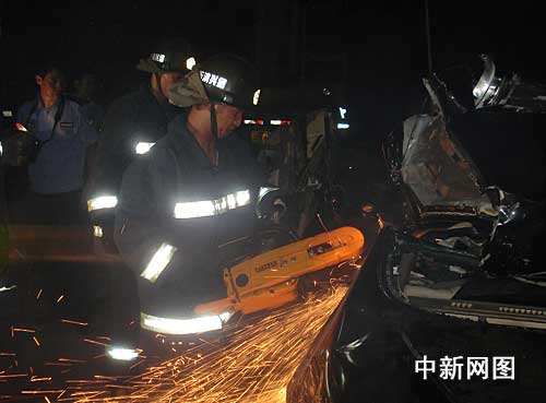记者在现场看到,经相撞后的小轿车已经严重变形,前车盖被冲击力掀起,车头严重内凹,挡风玻璃碎落一地,座椅上更是血迹斑斑。小轿车内原坐有四人,正副驾驶室座位内的两人当场死亡,而后座的两位伤者则被硬生生卡在车体中,身上多处伤口流血,并不时发出低沉的呻吟声,情况十分危急。距该车一百米外的大货车更是冲到了路基下面,所幸没有人员伤亡。