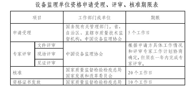 4 核准与公告 1 国家质检总局受理之日起20 天内会同国家发改委完成核准决定 2 在做出核准决定的10 个工作日内国家质检总局向申请方颁发设备监理单位资格资格证书 3 国家质检总局在做出核准决定后在国家质检总局网站http://www.aqsiq.gov.cn 中国设备监